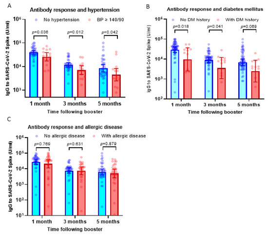 The antibody response in participants with histories of diabetes mellitus (DM) and allergic diseases was also analyzed. Similar to participants with hypertension, we observed significantly lower antibody levels in subjects with a history of diabetes mellitus at 1–5 months following booster vaccination (Figure 2B). However, in contrast with the finding above, participants with allergic diseases displayed comparable levels of serum IgG following boosters compared to those without allergic diseases (Figure 2C).