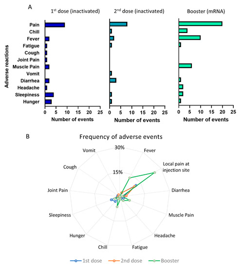 Adverse events following priming and booster doses of COVID-19 vaccination. (A) Number of adverse events following the 1st and 2nd doses of inactivated viral vaccine and booster doses of mRNA vaccine. (B) Radial graph showing the frequency of adverse events comparing the 1st, 2nd, and booster doses of vaccination.