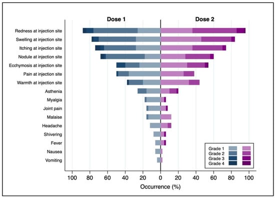 For both local and systemic AEFIs, mostly Grade 1 and 2 reactions were reported. Only two occurrences of Grade 3 and 4 systemic AEFIs (requiring medical attention) were registered. First-dose local AEFIs occurred in 6.9% of cases that were Grade 3 and in 9.9% of cases that were Grade 4. Second-dose local AEFIs occurred in 10.0% of cases that were Grade 3 and in 4.0% of cases that were Grade 4. It was likely that the persistence and severity of the local reactions led to the seeking out of medical consultations and the use of topical medication. Finally, no unexpected and/or serious adverse reactions or deaths attributable to the vaccination were observed.