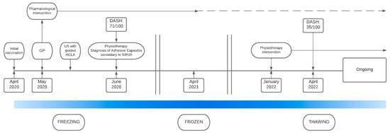 Following initial vaccination, the patient experienced an initial freezing stage of approximately 3 months in which she underwent pharmacological intervention including US guided HCLA injection. During the frozen stage, lasting approximately 18 months, pharmacology intervention was utilised to manage pain. Once thawing, demonstrated by a gradual increase in range of motion, was noted physiotherpay intervention was reintroduced. A visual timeline of the patient experience, including timing of pharmacological and physiotherpay interventions, is presented in Figure 2.