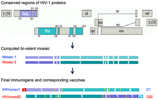 - Ondondo, B.; Murakoshi, H.; Clutton, G.; Abdul-Jawad, S.; Wee, E.G.; Gatanaga, H.; Oka, S.; McMichael, A.J.; Takiguchi, M.; Korber, B.; et al. Novel Conserved-region T-cell Mosaic Vaccine With High Global HIV-1 Coverage Is Recognized by Protective Responses in Untreated Infection. Mol. Ther. 2016, 24, 832–842. [Google Scholar] [CrossRef] [PubMed]