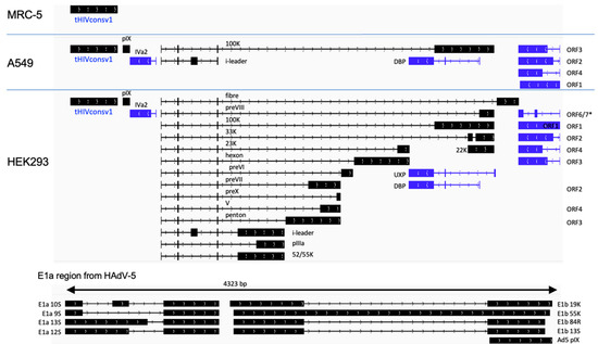 In the HEK293 cells supplying the HAdV-5 E1 function in trans to the ChAdOx1 E1-deficient vector, a full range of adenovirus transcripts were detected (Figure 2 and Figure 3). Our ORF-centric pipeline confirmed a wide range of adenovirus transcripts and showed that the viral backbone transcripts dominate in this cell line (Table 4). Moreover, as expected, we were also able to detect adenovirus transcripts from the E1 region of the HAdV-5 genome that is integrated onto the HEK293 genome.