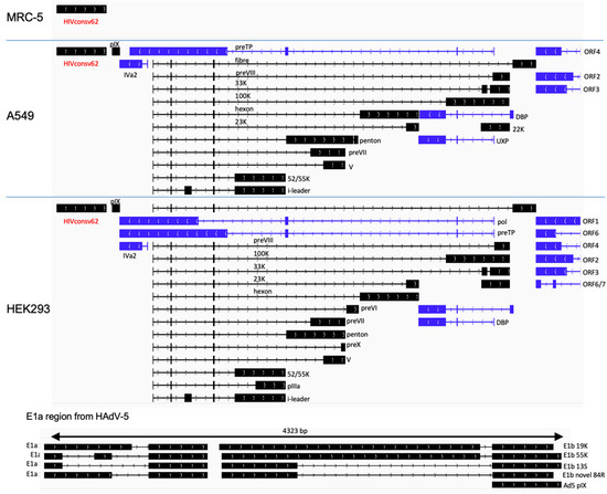 The adenovirus transcriptome was analyzed in human MRC-5 cells [56], which is a genetically normal male human lung fibroblast-like cell line isolated from a 14-week-old embryo, A549 cells [57], which are a human male lung epithelial-like continuous cell line derived from carcinomatous tissue, and HEK293 cells [13], which are a human embryonic kidney epithelial cell line immortalized by the integrated HAdV-5 E1 region. All cell lines were obtained from the European Collection of Authenticated Cell Cultures (ECACC). The cells were cultured in the DMEM-10 medium (DMEM supplemented with 10% foetal bovine serum (FBS), 100 U/mL penicillin and 100 µg/mL streptomycin), infected at the confluence with each of the ChAdOx1-vectored viruses at a multiplicity of infection (MOI) of 10 to achieve synchronous infection and harvested for the extraction of RNA at 48 h post-infection for the MRC-5 and A549 cell lines and 24 h post-infection from the HEK293 cell line.