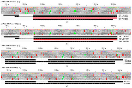 There is a wide range of minor transcripts with unusual promoters, splicing pat-terns and/or polyadenylation sites derived from both C1 and C62 vaccines grown in HEK293 cells (Table S1). These are usually very rare in the A549 datasets (i.e., fewer than 10 transcripts per example) (Table S2) and typically not found at all in the MRC-5 infected cells (Table S3). We assessed the per cent of transcripts coming from the transgene promoter with unintended splice sites to be between 2.4% and 3.4% of the total transcripts from that promoter with no splicing (Tables S2 and S3). We did observe some unusual transcripts in HEK293 cells, which included a novel promoter driving the expression of pIX from a spliced transcript (Figure 4a,b). In addition, we noted a substantial number of transcripts driven from another promoter further upstream (Figure 4c,d), which could lead to the expression of a protein with no known homology (MLGMRWALWLLRRKEPAGARGGIDPSRYLDPAFLYKVVIDSTDRDRTS). This transcript is only present in the HEK293-derived dataset. A retrospective analysis of our published data from ChAdOx1 nCoV-19 transcripts in HEK293 cells [39] revealed the presence of this transcript in that dataset too. Without matching proteomics data, it is uncertain whether this protein is made in HEK293 cells or if it plays any role during viral infection, but there are no known homologues and this transcript was not present in the HAdV-5-infected HEK293 transcriptome [32].