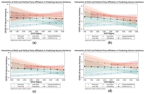 Our data also suggest that across all four types of SUD stigmas, Republicans were more likely to be vaccine hesitant than Democrats. We then examined the interaction between substance use stigma and political party affiliation when predicting COVID-19 vaccine hesitancy, and we found that for stigma toward OUD, CUD, MUD, and AUD, Republicans tended to be the most vaccine hesitant group, irrespective of their substance use stigma level. Additionally, when Democrats had a low substance use stigma level, they tended to have a low level of vaccine hesitancy compared with other groups, which tended to exhibit a midrange level of vaccine hesitancy, even at low substance use stigma levels. It is also interesting to note that these interactions were fairly similar across all forms of SUD stigma, even stigma toward AUD.