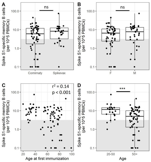 A subset of older adults does not generate a good memory B cell response after the SARS-CoV-2 primary immunization series. The SARS-CoV-2 Spike S1 memory B cell response 28 days after completion of the primary immunization series was compared between Comirnaty (N = 59) and Spikevax (N = 28) immunization (A), male (N = 35) or female (n = 52) participants (B), and between participants split into two different age groups (N = 26 for 20–50 and N = 61 for 50+) (D). Samples within the grey box are below the cut-off and are considered low-responders. The lower and upper hinges of the boxplot indicate the 25th and 75th percentile, with the middle line indicating the median. The whiskers extend up to 1.5 × the inter-quartile range. A potential correlation between SARS-CoV-2 Spike S1 memory B cells and age was further investigated (N = 87) (C). Groups were compared using a Mann–Whitney U test. Correlations were investigated using a Pearson correlation. PBMCs = peripheral blood mononuclear cells; ns = not significant; *** = p < 0.001.