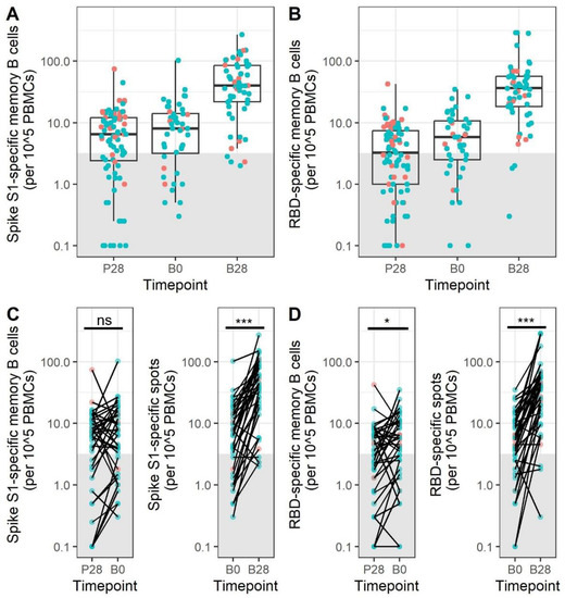 SARS-CoV-2 mRNA booster immunization increases the memory B cell response. SARS-CoV-2 Spike S1-specific (A) and RBD-specific (B) memory B cell responses are shown at different timepoints after mRNA immunization. N = 87, 44, and 58 at P28, B0, and B1, respectively. The lower and upper hinges of the boxplot indicate the 25th and 75th percentile, with the middle line indicating the median. The whiskers extend up to 1.5 × the inter-quartile range. Samples within the grey box are below the cut-off for positivity. Changes in memory B cell responses over time in paired samples are shown for SARS-CoV-2 Spike S1 (C) and RBD (D). N = 43 for samples paired between P28 and B0. N = 41 for samples paired between B0 and B1. Red dots indicate participants aged 20–50, while blue dots indicate participants over 50 years of age. Groups were compared with a paired Wilcoxon signed-rank test. P28 = 28 days after the primary immunization series; B0 = before booster immunization; B28 = 28 days after booster immunization; PBMCs = peripheral blood mononuclear cells; RBD = receptor-binding domain; ns = not significant, * p < 0.05, *** = p < 0.001.