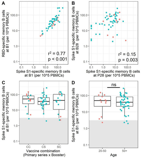 SARS-CoV-2 booster immunization decreases age differences in the memory B cell response. A correlation between Spike S1- and RBD-specific spots at B28 in the same participants is shown for participants positive for both RBD and Spike S1 (N = 54) (A). A correlation between SARS-CoV-2 Spike-S1-specific memory B cells at P28 and B28 is shown (N = 58) (B) The strength of the correlations was estimated with a Pearson correlation. The SARS-CoV-2 Spike S1 memory B cell response 28 days after completion of the booster immunization was compared between different vaccine combinations (C) and between participants split into two different age groups (D). (N = 15, 28, and 15 for CCC, CCS, and SSC, respectively (C indicates Comirnaty, S indicates Spikevax)). (N = 12 and N = 46 for the 20–50 and 50+ age groups, respectively). The lower and upper hinges of the boxplot indicate the 25th and 75th percentile, with the middle line indicating the median. The whiskers extend up to 1.5 × the inter-quartile range. Samples within the grey box are below the cut-off for positivity. The strength of the correlation was estimated with a Pearson correlation. Red dots indicate participants aged 20–50, while blue dots indicate participants over 50 years of age. P28 = 28 days after completion of the primary vaccination series; B28 = 28 days after booster immunization; PBMCs = peripheral blood mononuclear cells; RBD = receptor-binding domain; ns = not significant.