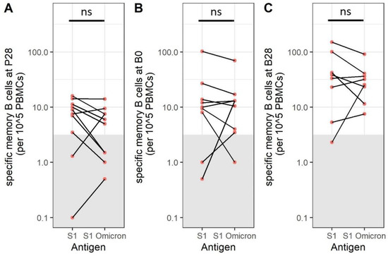 The amount of SARS-CoV-2 Spike S1-specific memory B cells is comparable to SARS-CoV-2 S1 Omicron-specific memory B cells. SARS-CoV-2 Spike S1- and Spike S1 Omicron BA.1-specific memory B cells are compared within the same samples at P28 ((A), N = 8), at B0 ((B), N = 9), and at B1 ((C), N = 8). Samples within the grey box are below the cut-off for positivity. Differences between groups were investigated with a Mann–Whitney U test. Red dots indicate participants aged 20–50, while blue dots indicate participants over 50 years of age. P28 = 28 days after the primary immunization series; B0 = before booster immunization; B28 = 28 days after booster immunization; PBMCs = peripheral blood mononuclear cells; ns = not significant.