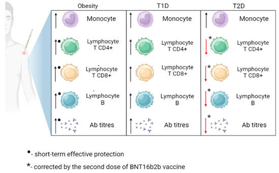 Immune response to SARS-CoV-2 vaccination in obese, type 1 diabetes (T1D), and type 2 diabetes (T2D) patients. Ab, antibodies. Obesity is associated with a transient increase in CD4+ T lymphocytes, CD8+ T lymphocytes, B lymphocytes, and antibody levels. The response to vaccination in individuals with T1D is comparable to that of healthy individuals. The second dose of the BNT16b2b vaccine led to an improvement in the levels of CD4+ T lymphocytes, CD8+ T lymphocytes, B lymphocytes, and antibody levels in individuals with T2D.