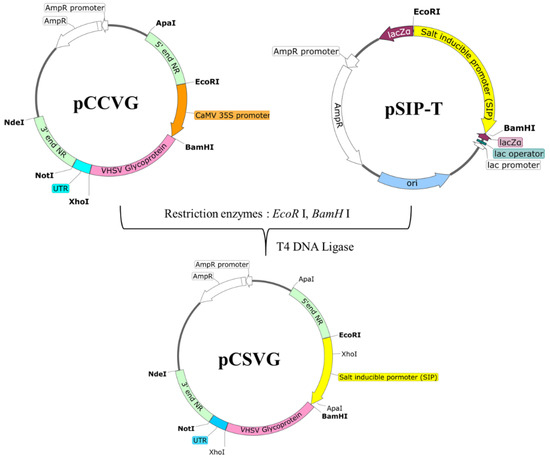 A Chlorella transformation vector containing the SIP (GenBank accession number OQ67458) from C. vulgaris PKVL7422 was constructed following a previously developed pCCVG vector as shown in Figure 1, with some modifications. pCCVG has two flanking sequences of 1000 bp derived from the NR gene of C. vulgaris PKVL7422 for integration via double homologous recombination encompassing the cauliflower mosaic virus (CaMV) 35S promoter, VHSV glycoprotein gene (GenBank accession number KM926343.1), and transcriptional terminator from the Rbcs2 gene of Chlamydomonas reinhardtii. Both pCCVG and pSIP-T carrying the SIP were digested with BamHI and EcoRI, and the CaMV 35S promoter in pCCVG was substituted with the SIP to construct pCSVG (Figure 1).