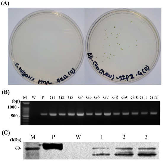 Selection and confirmation of transformant expressing VHSV glycoprotein. (A) Selection of transformants on BGNK plates in the dark: left panel, wild-type C. vulgaris PKVL7422; right panel, transformed C. vulgaris. (B) Detection of DNA insert with PCR analysis of selected transformed cells. Lane M, DM3200 DNA marker (SMOBiO Technology, Hsinchu, China); lane W, wild-type C. vulgaris PKVL7422; lane P, positive control (plasmid vector); lanes G1–G12, transformed C. vulgaris (SIPG). (C) Western blotting analysis of selected transformed cells. Lane PM, PM2700 protein marker (SMOBiO); lane V, purified VHSV (positive control); lane W, wild-type C. vulgaris PKVL7422; lanes 1–3, transformed C. vulgaris.