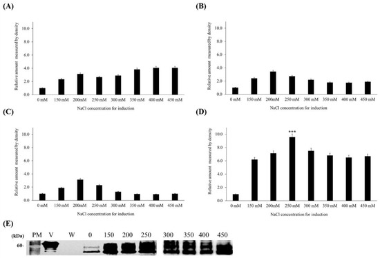 Comparison of VHSV glycoprotein expression according to treatment time and NaCl concentration. (A–C) Relative expression levels of VHSV glycoprotein in cells treated for 30 min (A), 60 min (B), and 120 min (C) with different concentrations of NaCl. (D) Relative expression level of VHSV glycoprotein in cells cultured for 5 days with different concentrations of NaCl. (E) Western blotting analysis for quantification of the expression levels in (D). Lane PM, PM2700 protein marker; lane V, purified VHSV (positive control); lane W, wild-type C. vulgaris PKVL7422; lane 0–450, transformed C. vulgaris cultured in the presence of the corresponding NaCl concentration (in mM). The expression level at 250 mM that was significantly different from those at other concentrations with p < 0.0001 is marked with ***.