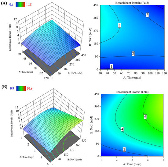 Figure 5 shows 3D surface plots and 2D contour graphs as graphical representations of the combined effects of salt concentration and time on VHSV glycoprotein expression. In the long-term treatment, the level of VHSV glycoprotein expression was six times higher in the presence of 170–450 mM NaCl compared with that in the untreated control.