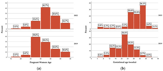 The overall gestational age, measured in weeks, was higher for the 2022 pregnant woman sample, with a mean difference of 7.22 weeks (95% CI 5.92–8.5 weeks, p < 0.01) (Figure 1b). In 2022, the sample presented a higher proportion of pregnant women with a higher pregnancy age, 90% being in the third trimester, while, for the 2019 sample, most of them were in the second trimester (approximately 81%).