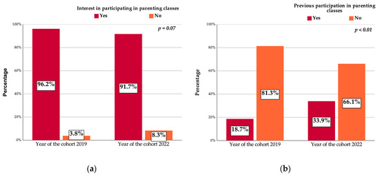More than 96% of the pregnant women from the 2019 sample and 91.7% from the 2022 sample expressed their interest to participate in parenting programs (p = 0.07, Figure 2a). At the same time, the percentage of pregnant women that previously took part in parenting programs raised during the pandemic time, going up from 18.7% in 2019 to 33.9% in 2022 (p < 0.01) (Figure 2). Figure 2a depicts the intention to participate in parenting classes, which was significantly higher when compared to the data from Figure 2b, where the actual previous participation in other educational programs was confirmed by the pregnant women.