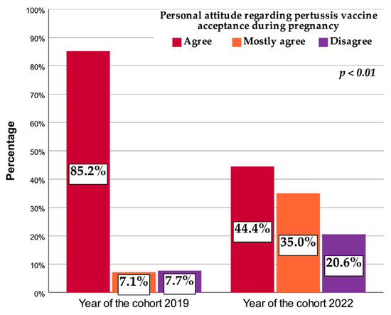 The percentage of pregnant women that would readily accept pertussis vaccination decreased in 2022 compared to 2019 from 85.2% to 44.4% (Figure 3). A five-fold increase was observed in the percentage of pregnant women hesitant towards pertussis vaccination during pregnancy (from 7.1% in 2019 to 35% in 2022) together with an almost three-fold increase in the percentage of pregnant women disagreeing with pertussis vaccination (from 7.7% in 2019 to 20.6% in 2022).