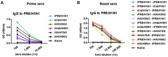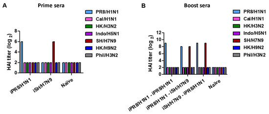 Figure 2. Representative data of HAI titers in immune sera collected after prime vaccination or homologous and heterologous prime-boost vaccinations. The immunization scheme (n = 5 per group) was the same as in Figure 1. Blood samples were collected 2 weeks after prime and boost immunizations, and sera were collected to analyze HAI titers. (A) HAI titers against different viruses are indicated as color bars in prime sera from the representative inactivated virus prime vaccination (iPR8/H1N1, iSH/H7N9). (B) HAI titers against different viruses as indicated in boost sera from representative homologous and heterologous vaccine groups.