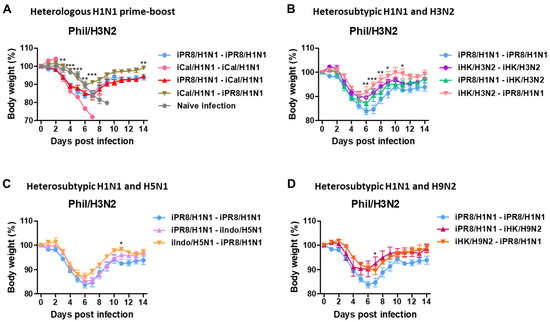 Figure 3. Body weight changes in the homologous and heterologous prime-boost groups after challenge with Phil/H3N2 virus. Immunization and challenge scheme (n = 5 mice per group) with the same vaccine groups as in Figure 1. Eight weeks post-boost immunization, the mice were challenged with a lethal dose of Phil/H3N2 virus (6.7 × LD50, equivalent to 9.4 × 102 EID50). (AD) Body weight changes were monitored for 14 days. Statistical significance was calculated using two-way ANOVA and Bonferroni’s post-multiple comparison test. Error bars indicate the mean ± SEM. *; p < 0.05, **; p < 0.01, ***; p < 0.001, compared to the iPR8/H1N1-iPR8/H1N1 group.