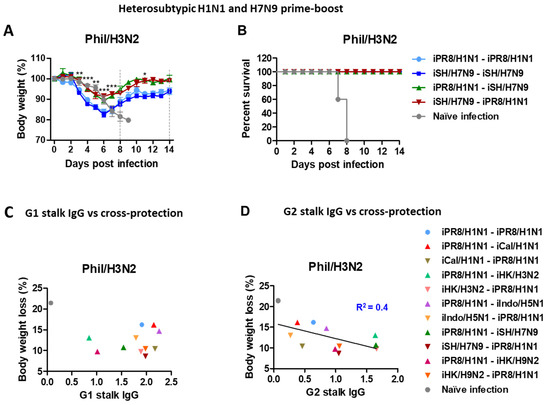 Figure 4. Body weight changes in the homologous and heterosubtypic iSH/H7N9-iPR8/H1N1 groups after Phil/H3N2 challenge and data plots for a possible correlation between HA stalk IgG levels and body weight loss. Immunization (n = 5 mice per group) with the same vaccine groups as in Figure 1 in addition to iCal/H1N1-iCal/H1N1, iHK/H3N2-iHK/H3N2 and iSH/H7N9-iSH/H7N9 prime-boost vaccine groups. Eight weeks post-boost immunization, the mice were challenged with the same dose of Phil/H3N2 virus (6.7 × LD50, equivalent to 9.4 × 102 EID50) as in Figure 3. (A,B) Body weight changes were monitored for 14 days. (C) Levels of G1 stalk-specific and (D) G2 stalk-specific IgG antibodies from boost sera were plotted against body weight loss percentages in the different vaccine groups after Phil/H3N2 virus challenge. A line represents the correlation with a coefficient of determination (R2) value of 0.4. Statistical significance was calculated using two-way ANOVA and Bonferroni’s post-multiple comparison test. Error bars indicate the mean ± SEM. *; p < 0.05, **; p < 0.01, ***; p < 0.001, comparison between iSH/H7N9-iSH/H7N9 and iSH/H7N9-iPR8/H1N1 groups.