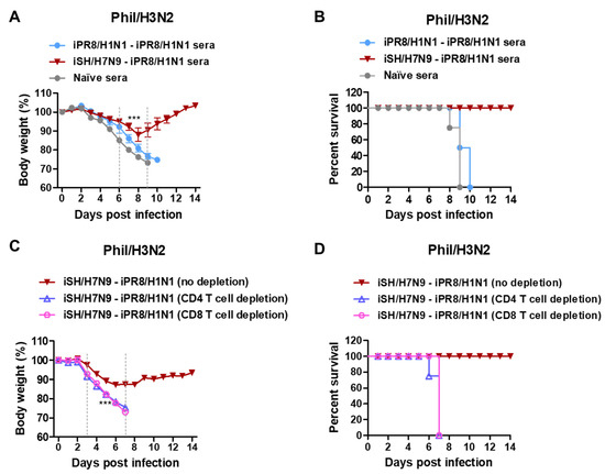 Figure 5. Immune sera and T cells from iSH/H7N9-iPR8/H1N1 prime-boost vaccination contribute to protection against A/Phil/H3N2 virus. (A) Body weight changes and (B) survival rates were monitored for 14 days in naïve mice (n = 4 per group) after inoculation with a mixture of Phil/H3N2 virus (3 × LD50, equivalent to 2.3 × 102 EID50) and boost immune sera. (C) Body weight changes and (D) survival rates in the iSH/H7N9-iPR8/H1N1 prime-boost immunized BALB/c mice (n = 4) with CD4 or CD8 T cells depleted and Phil/H3N2 virus challenge. Statistical significance was calculated using two-way ANOVA and Bonferroni’s post-multiple comparison test. Error bars indicate the mean ± SEM. ***; p < 0.001 compared to the naïve sera group in (A) and no depletion group in (C).