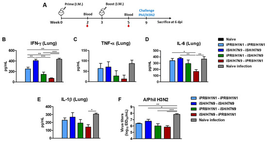 Figure 6. Heterosubtypic prime-boost vaccination controls inflammatory cytokines and lung viral loads. (A) Immunization scheme (n = 4 per group). Five to six weeks post-boost immunization, the mice were challenged with a lethal dose of Phil/H3N2 virus (6.7 × LD50, equivalent to 9.4 × 102 EID50). (B) IFN- γ, (C) TNF-α, (D) IL-6, and (E) IL-1β cytokine levels in lung extracts at day 6 post-infection. (F) Lung viral titers as 50% egg infectious titers (EID50) at day 6 post-infection using embryonated chicken eggs. Statistical significance was calculated using one-way ANOVA and Tukey’s post-multiple comparison test. Error bars indicate the mean ± SEM. Lines under * symbols mark the comparing groups. *; p < 0.05, **; p < 0.01, ***; p < 0.001.