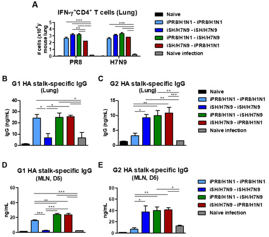 Figure 7. Cytokine-producing and stalk-specific IgG-secreting lung cellular responses after heterosubtypic prime-boost vaccination and Phil/H3N2 virus challenge. Immunization scheme (n = 4 per group) with the same vaccine groups as in Figure 6. (A) Flow cytometry data of IFN-γ-producing CD4+ T cells in lung samples at day 6 post-infection after stimulation with inactivated PR8/H1N1 or SH/H7N9 virus. (B) G1 and (C) G2 HA stalk-specific IgG levels in lung samples collected on day 6 post-challenge. (D) Groups 1 and (E) 2 HA stalk-specific IgG production from MLN cells harvested on day 6 post-infection, cultured in vitro for 5 days in the presence of G1 or G2 HA stalk proteins. Statistical significance was calculated using one-way ANOVA and Tukey’s post-multiple comparison test. Error bars indicate the mean ± SEM. *; p < 0.05, **; p < 0.01, ***; p < 0.001.