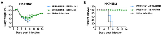 Figure 8. Heterosubtypic prime-boost vaccinations induce cross-protection against heterologous HK/H9N2 viruses. Immunization scheme (n = 3 per group) with the same vaccine groups as in Figure 6. (A) Body weight changes and (B) survival rates were monitored for 14 days after HK/H9N2 virus (6.7 × LD50, equivalent to 2.3 × 103 EID50) challenge. Statistical significance was calculated using two-way ANOVA and Bonferroni’s post-multiple comparison test. Error bars indicate the mean ± SEM. *; p < 0.05 compared to the iPR8/H1N1-iPR8/H1N1 group.