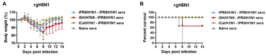 To further understand whether the protection conferred by immune sera was because of differences in hetero prime-boost immunizations with group-specific HA stalk antigens, naïve BALB/c mice were intranasally inoculated with a mixture of rgH5N1 virus at a lethal dose and antisera that were collected from vaccinated or naïve mice. Naïve sera did not provide protection against rgH5N1 virus, as evidenced by severe weight loss (> 25%) and 0% survival rate in naïve mice (Figure 9A,B). In contrast, immune sera from the hetero-G1 iCal/H1N1-iPR8/H1N1 group conferred protection in naïve mice with moderate weight loss (~6%) and 100% survival rate against G1 rgH5N1 virus. Notably, immune sera from the iPR8/H1N1-iPR8/H1N1 group conferred better protection (~10%) against G1 rgH5N1 virus than immune sera from the G2-G1 iSH/H7N9-iPR8/H1N1 group (>16% weight loss), although the difference was not statistically significant. These results suggested that immune sera from the groups that were vaccinated with G1 hetero viral antigens during prime and boost (iCal/H1N1-iPR8/H1N1) conferred better protection against G1 H5N1 virus than hetero-group HA prime-boost sera (iSH/H7N9-iPR8/H1N1).