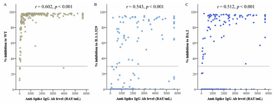Correlation between anti-spike antibody level against wild-type SARS-CoV-2 and percent inhibition of neutralizing Ab against SARS-CoV-2 variants. Anti-spike IgG level and percent inhibition of neutralizing Ab against (A) wild-type, (B) Omicron B.1.1.529 and (C) Omicron BA.2 variants. Dotted lines indicate cut-off values.
