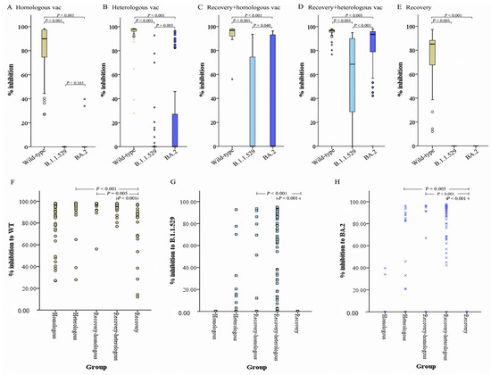 Comparison of percent inhibition of neutralizing Ab against SARS-CoV-2 strains in five different subject groups. (A–E) Three SARS-CoV-2 strains (wild-type, Omicron B.1.1.529, and Omicron BA.2 variants) were compared in terms of percent inhibition of neutralizing Ab among five different study subjects (homologous vaccinees, heterologous vaccinees, recovering patients with homologous vaccination, recovering patients with heterologous vaccination, and recovering patients, respectively); (F–H) Five different study subjects were compared in terms of percent inhibition of neutralizing Ab against three viruses (wild-type, Omicron B.1.1.529, and Omicron BA.2 variants), respectively.