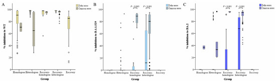 Comparison of percent inhibition of neutralizing Ab against wild-type, Omicron B.1.1.529 and Omicron BA.2 SARS-CoV-2 during Delta wave and Omicron wave in five different subject groups: (A) percent inhibition of neutralizing Ab against wild-type, (B) Omicron B.1.1.529, and (C) Omicron BA.2 variants), respectively.