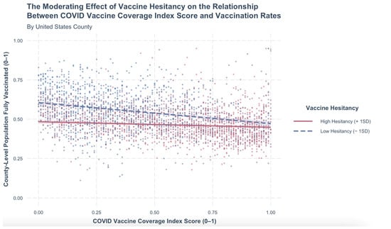 While psychological factors for vaccine hesitancy differ based on sociodemographic characteristics, time, and context [], the ultimate impact of vaccine hesitancy is the same: reduced vaccine uptake and diminished herd immunity [,,,]. Thus, when making decisions about public health policy and interventions that aim to promote vaccine uptake at the county-level, it is essential to consider social and structural barriers to vaccination as well as psychological barriers. However, no known studies have investigated the influence that vaccine hesitancy has on county-level vaccine coverage in light of social and structural barriers. If vaccine hesitancy moderates the relationship between structural barriers and vaccine coverage at the county level, then merely addressing structural barriers to vaccine access may be insufficient to promote large-scale vaccine coverage.