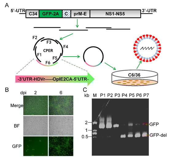 We adopted a construction and recovery procedure for CxFV-GFP similar to that of ChinZIKV. The whole genome of CxFV-GFP was divided into six fragments with 32–86 bp overlaps between adjacent fragments. We codon-optimized the GFP gene for better expression in mosquito cells. Notably, the shortest fragment was as short as 98 bp. A total of six fragments were assembled into a single circular CPER product. A fluorescent signal was observed in infected C6/36 cells as early as 2 dpi and increased during the course of infection, suggesting the successful recovery of CxFV-GFP (Figure 4B). Reporter viruses harboring foreign genes have been reported unstable and are prone to loss of the reporter gene during passaging [65,66]. To test the genetic stability of CxFV-GFP, we serially passaged CxFV-GFP in cell culture and monitored the magnitude of fluorescence in the infected cells. CxFV-GFP began to lose its reporter gene after three passages, which was corroborated using gel electrophoresis analysis of RT-PCR products containing the GFP gene (Figure 4C). Thus, CxFV-GFP is not genetically stable. Taken together, using the CPER method, we have de novo synthesized a live reporter CxFV-GFP.