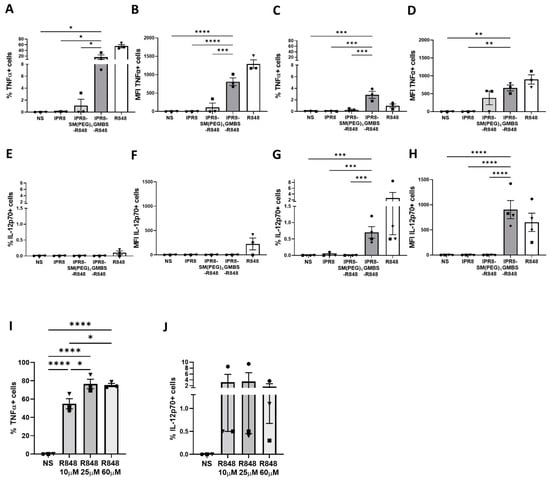 The choice of linker impacts the percentage of human moDCs responding to R848-conjugated influenza virus vaccines as well as the amount of cytokine produced. CD14+ PBMCs were isolated from healthy adult donors and cultured for 7 days in the presence of 10 ng/mL of human IL-4 and GM-CSF. Human moDCs were stimulated in vitro with IPR8, IPR8-SM(PEG)4-R848, IPR8-GMBS-R848 (all vaccines 10 μg/mL), R848 (10 µM), or non-stimulated (NS). Intracellular cytokine production was determined using flow cytometry. The percentage of TNFα + CD11c+ cells and the MFI were assessed between 0 and 12 h (A,B) and 12 and 24 h (C,D) post stimulation, respectively. The percentage of IL−12p70 + CD11c+ cells and the MFI were assessed between 0 and 12 h (E,F) and 12 and 24 h (G,H) post stimulation, respectively. Human moDCs were also stimulated with different concentrations of soluble R848 (10 µM, 25 µM, and 60 µM) and the percentage and MFI of TNFα + CD11c+ cells (I) and IL−12p70 + CD11c+ (J) were assessed. The data represent mean ± SEM from 3–4 donors. Symbols on graph represent individual donors. Statistical significance for all vaccine stimulations (excluding R848) was assessed using a one-way ANOVA with post hoc Fisher’s LSD multiple comparison analysis. * p = < 0.05, ** p = < 0.005, *** p = < 0.0005, **** p = < 0.0001.