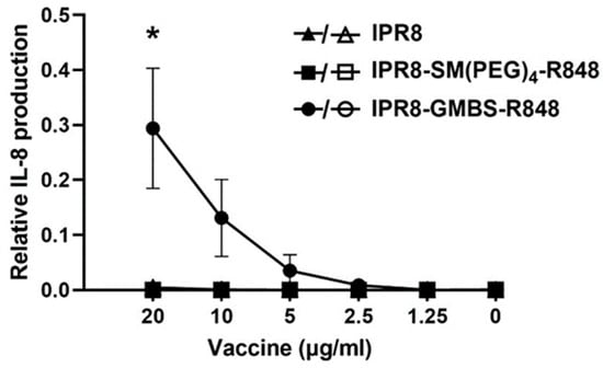 Assessment of IL-8 production from vaccine stimulated human TLR7 HEK cells. 293XL-hTLR7 cells (InvivoGen, San Diego, CA, USA) (1 × 105 cells/well) were cultured in 96-flat bottom plates overnight. Cells were cultured in DMEM, 4.5 g/L glucose, 10% FBS (Atlanta Biologicals, Lawrenceville, GA, USA), 50 U/mL penicillin, 50 µg/mL streptomycin, 2 mM L-glutamine (Gibco, Billings, MT, USA), and 10 µg/mL of Blasticidin (InvivoGen, San Diego, CA, USA) (selective antibiotic). As a negative control, HEK-Blue Null1 cells (InvivoGen, San Diego, CA, USA) (4 × 104–1 × 105 cells/well) were cultured in 96-flat-bottom plates. Cells were stimulated in vitro for 24 h with a dose titration (20 µg/mL–1.25 µg/mL) of IPR8, IPR8-SM(PEG)4-R848, or IPR8-GMBS-R848. Cells were also stimulated with a dose titration (10 µM–0.078 µM) of R848 (Enzo Life Sciences, Farmingdale, New York, NY, USA) alone to serve as a positive control, or were left non-stimulated (NS). Supernatant was harvested after 24 h and the IL-8 production was measured using a human IL-8 ELISA Max kit (Biolegend, San Diego, CA, USA). The concentration of IL-8 was calculated per the manufacturer’s instructions using the kit’s standard. We determined the relative IL-8 production from the cells by normalizing the concentration of IL-8 at each vaccine dose relative to the maximum concentration of IL-8 made in the positive control R848 stimulated cells (5–10 µM) for each experiment. This normalization approach was used to allow for the analysis of the IL-8 response to each vaccine in a manner that accounts for any potential variations in cell line responsiveness across independent experiments.