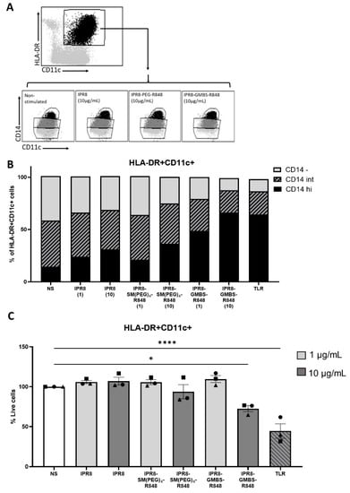 Although we did observe moderate levels of cell death in the high dose IPR8-GMBS-R848 and TLR cocktail stimulated groups, the shift in CD14 expression cannot be solely attributed to this, as an increase in the proportion of CD14 expressing APCs under conditions that do not increase cell death was observed in the IPR8-GMBS-R848 1 µg/mL stimulated cells (Figure 6C). These data support a model wherein stimulation is driving increased expression of CD14 on HLA-DR+ CD11c+ cells.