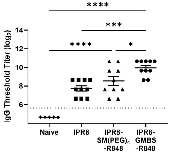 Vaccination with IPR8-GMBS-R848 results in increased PR8-specific IgG antibody. BALB/c mice (n = 10) were vaccinated intramuscularly (i.m.) with 0.03 µg of IPR8, IPR8-SM(PEG)4-R848, or IPR8-GMBS-R848. Blood was collected 14 days p.v. Naïve BALB/c mice (n = 5) serum was used as a negative control. The circulating levels of PR8-specific total IgG was assessed by ELISA. Threshold titer (TT) was defined as the highest dilution at which the sample’s optical density was at least 3 times that of the assay background. The limit of detection is represented by the dashed line. Data represent mean ± SEM from mice vaccinated in two independent experiments. Symbols on graph represent different vaccine groups. Statistical significance was assessed using a one-way ANOVA with post hoc Tukey’s multiple comparison analysis * p = < 0.05, *** p = < 0.0005, **** p = < 0.0001.