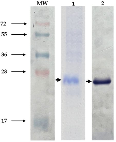 The sequence for the Bm86 fragment encodes 178 amino acids and was derived from the R. microplus “Media Joya” tick strain. The immunogenic region selected was expressed in E. coli as an inclusion body, solubilized using 8 M urea, and purified by His-affinity chromatography. After induction, expression levels of the polypeptide Bm86 reached approximately 10% of total cellular proteins. The molecular size was approximately 26 kDa, based on visualization on SDS-PAGE gels and Western blot using an anti-His monoclonal antibody recognized the His6x-fusion protein on the C-terminal of the pBm86 (Figure 2). The purified recombinant polypeptide Bm86 was successfully obtained, and the sample purity was analyzed and estimated to be 90% pure.