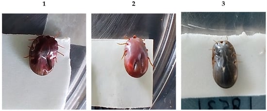 Ticks were collected from experimental groups on day 56. The damaged tick engorged on (1) polypeptide Bm86 and (2) Bm86 showed a characteristic dark-red coloration. (3) Ticks collected from controls.