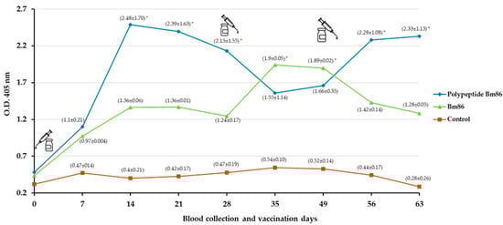 The humoral immune response of cattle immunized with the polypeptide Bm86 and the formulation containing the Bm86 antigen are shown in Figure 4. The IgG levels in the polypeptide Bm86-immunized animals increased after the first immunization and decreased after the second immunization, achieving at least 2.40 OD units compared to the control group. Cattle immunized with the Bm86 antigen generated a slightly humoral immune response one week after the second booster. However, a significant decline occurred after the third booster obtained, at most, 1.90 OD IgG levels. These results showed that antibody levels were atypical in all animals tested and only were significantly different (p < 0.05) on some days of the experiment.