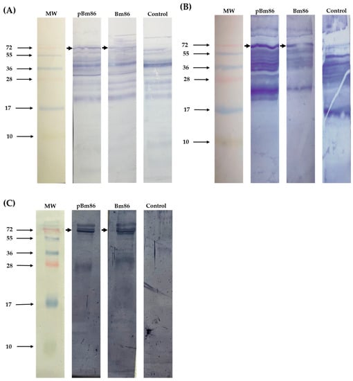 Western blot of R. microplus tick tissues probed with anti-Bm86 IgG antibodies. 10 µg of (A) egg, (B) larvae, and (C) guts sections were loaded per well in 15% SDS-PAGE gels and transferred to PVDF membranes. Sera from one representative cow per group were used and developed with an anti-bovine IgG-AP conjugate. Native Bm86 protein is indicated with arrows. MW, molecular weight.