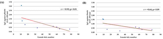 The Spearman’s Rho correlation analyses (p < 0.05) were conducted to correlate the IgG antibody levels in immunized cattle with the adult female tick number collected during the experimental trial in individual cattle (N = 8). (A) polypeptide Bm86, and (B) Bm86. The linear correlation coefficients (r) and p-value are shown.