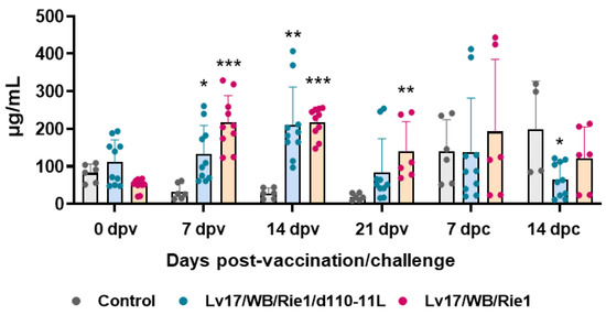 Kinetics of C-reactive protein levels in sera samples taken throughout the experiment. Sera samples were taken through the experiment and C-reactive protein levels were monitored though ELISA. Data from three (controls, grey) or five (vaccinated with Lv17/WB/Rie1/d110-11L, quite blue) or five (vaccinated with Lv17/WB/Rie1, orange) different pigs are shown. At each time point, values of vaccinated pigs (Lv17/WB/Rie1/d110-11L or Lv17/WB/Rie1) were compared to controls; * p < 0.05, ** p < 0.01, *** p < 0.001.