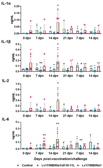 Serum pro-inflammatory cytokines levels in vaccinated and control pigs. Sera samples were taken throughout the experiment and their levels of IL-1α, IL-1β, IL-2, IL-6 were monitored though ELISA. Data from three (controls, grey) or five (vaccinated with Lv17/WB/Rie1/d110-11L, quite blue) or five (vaccinated with Lv17/WB/Rie1, orange) different pigs are shown. At each time point, values of immunized pigs (Lv17/WB/Rie1d110-11L or Lv17/WB/Rie1) were compared to controls; * p < 0.05, ** p < 0.01.