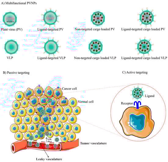 (A) The variety of nanoparticle formulations based on plant viruses, (B) These formulations of plant virus-based nanoparticles (PVNPs) have the ability to concentrate drug and imaging agents through passive-targeting delivery reliant on the enhanced permeability and retention (EPR) outcome in tumors, (C) Active targeting can be achieved by attaching ligands specific to the biomarkers present on cancer cells to the surface of PVNPs, allowing for the specific targeting of cancer cells [61].