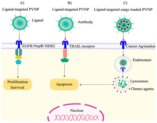 Mechanisms through which plant virus nanoparticles may effectively target cancer cells. The presentation of specific ligands on plant virus nanoparticles has been investigated for the purpose of (A) impeding the survival and proliferation pathways, (B) instigating the apoptotic pathways, and (C) loading and distributing therapeutic agents [61].