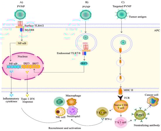Mechanisms by which plant virus nanoparticles can target immune cells. Plant virus nanoparticles can act as ligands for (A) surface and (B) endosomal PRRs on innate immune cells, or (C) loading and delivery of cancer antigens, therefore active cellular and humoral immune responses against tumor [61].