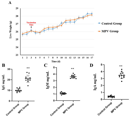 Live weights and serum antibody levels were compared between the MPV and control groups (n = 12). (A) Live weight comparison. (B) IgG level in serum. (C) IgM level in serum. (D) IgA level in serum. Significant differences are indicated by ** (p < 0.01).