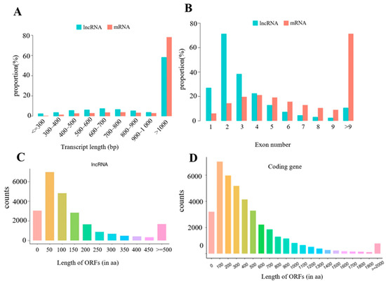 Genomic features of the obtained lncRNAs. (A) Transcript length distributions of obtained lncRNAs and mRNAs. (B) Exon number distributions of obtained lncRNAs and mRNAs. (C) Length of ORF distributions of obtained lncRNAs. (D) Length of ORF distributions of obtained mRNAs.